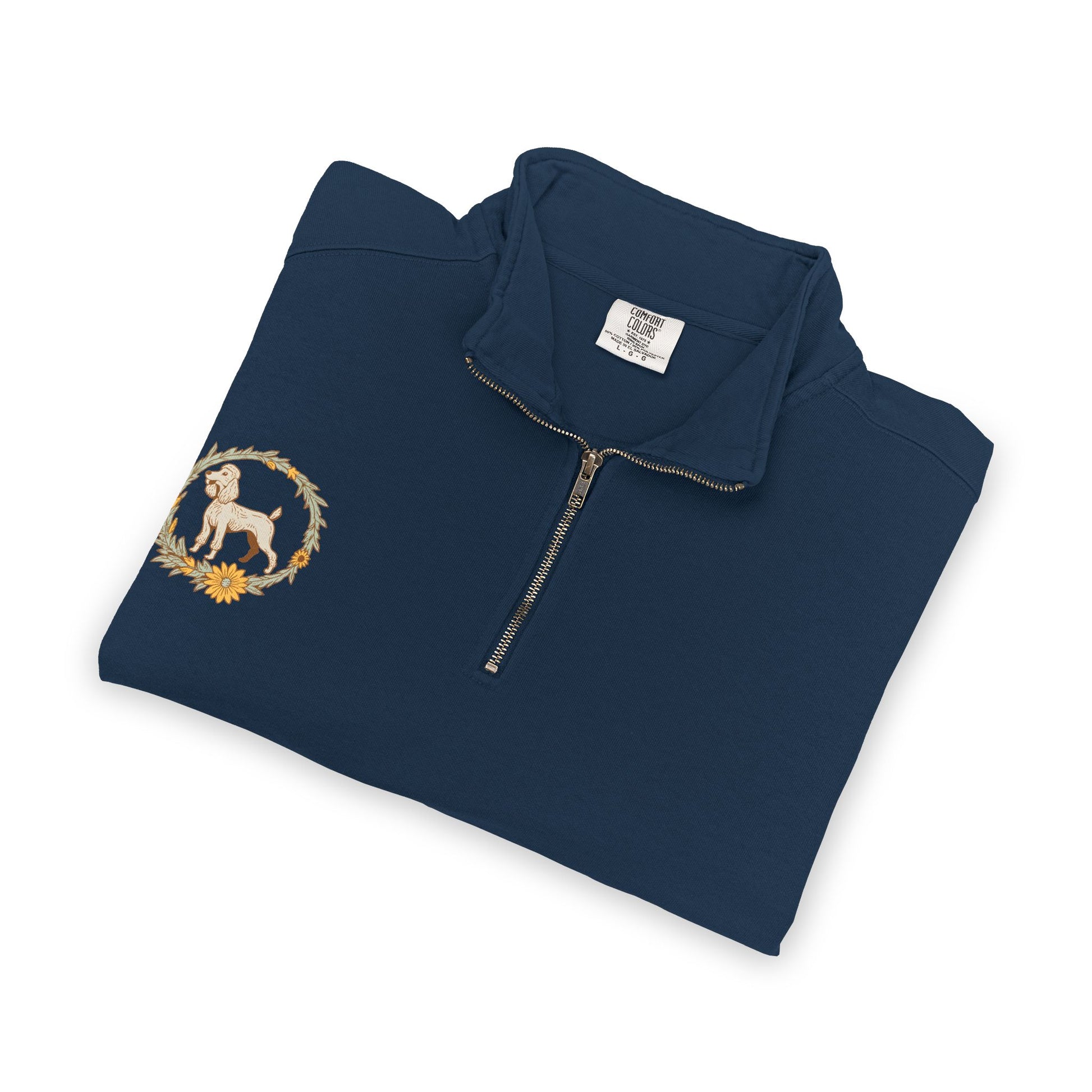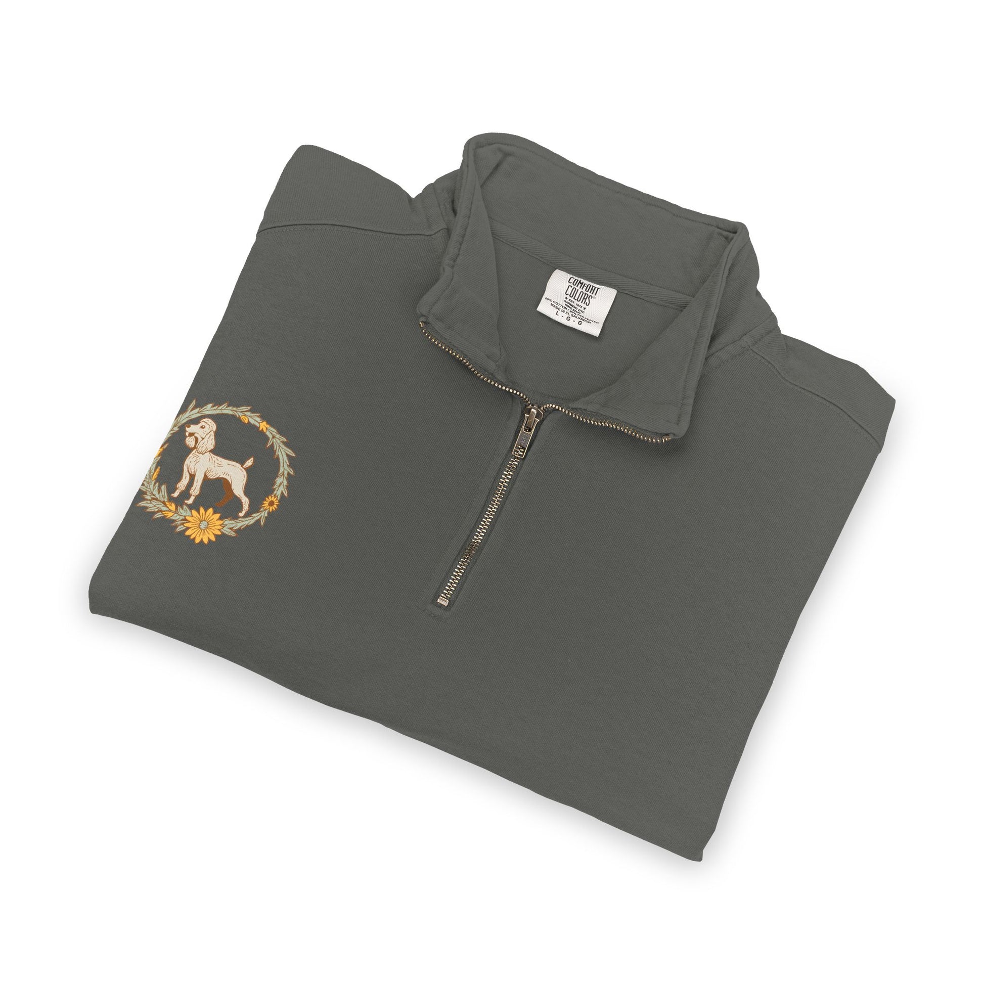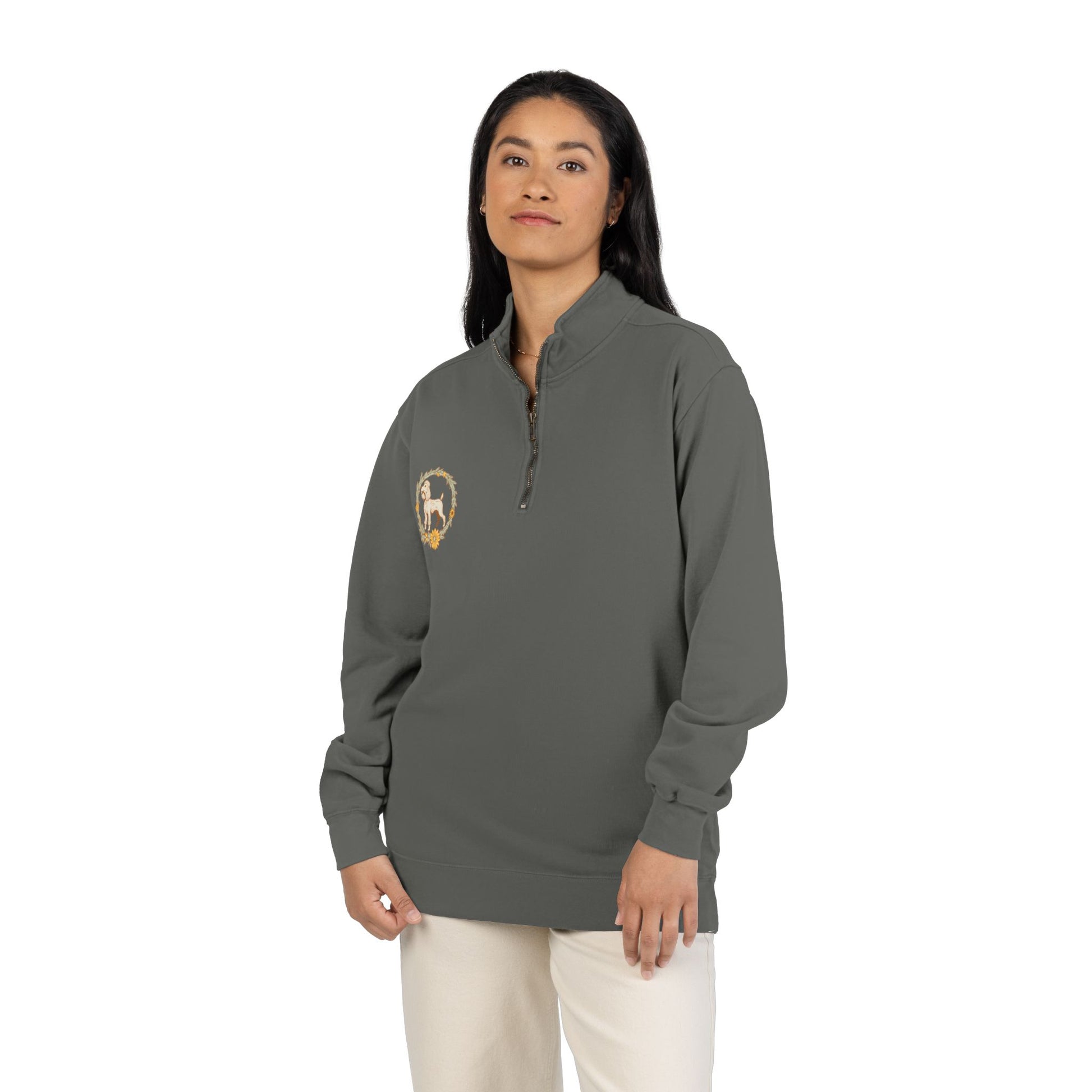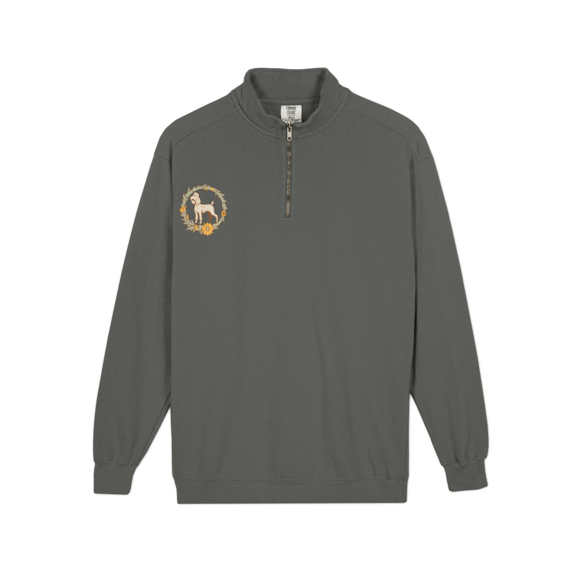 Soft, substantial quarter-zip crafted for animal lovers who prefer a calm, vintage vibe. The muted slate fabric and detailed floral wreath artwork frame a classic dog illustration that reads as handcrafted and familiar. Wear it after morning walks, at grooming appointments, or layered on crisp evenings—its relaxed fit and self-lined collar keep you comfortable without feeling bulky. The half-zip makes it easy to cool off during active moments; ribbed cuffs and waistband hold shape through repeated wear. It feels lived-in from the first put-on and pairs naturally with denim or your favorite work boots.