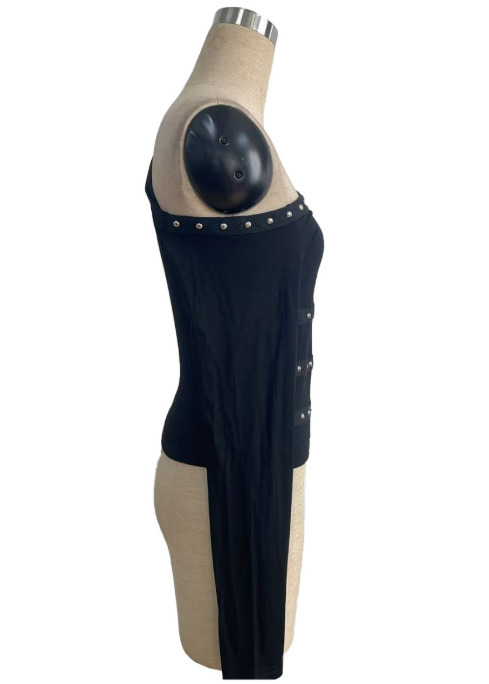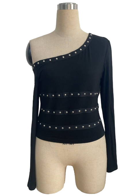 Sexy Shoulder Collar Metal Ribbon Nail Decoration Slim T shirt